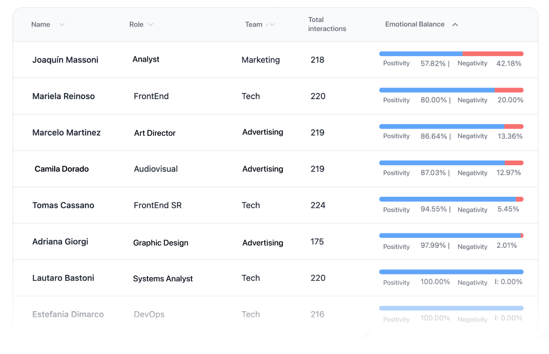 Descubre cómo está tu equipo sin preguntar. Nuestra IA detecta más de 150 emociones, mide su impacto y muestra cómo afectan al grupo. Sin encuestas ni esfuerzo extra, solo datos claros para apoyar y hacer crecer a tu equipo.