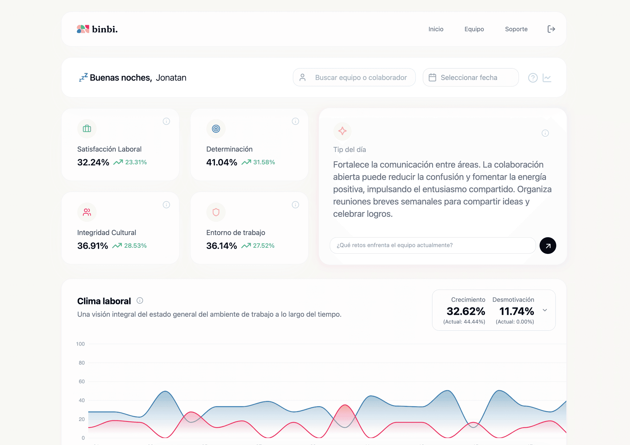 Binbi analiza las emociones de tu equipo para duplicar la productividad, triplicar la satisfacción laboral y predecir el burnout y la rotación.